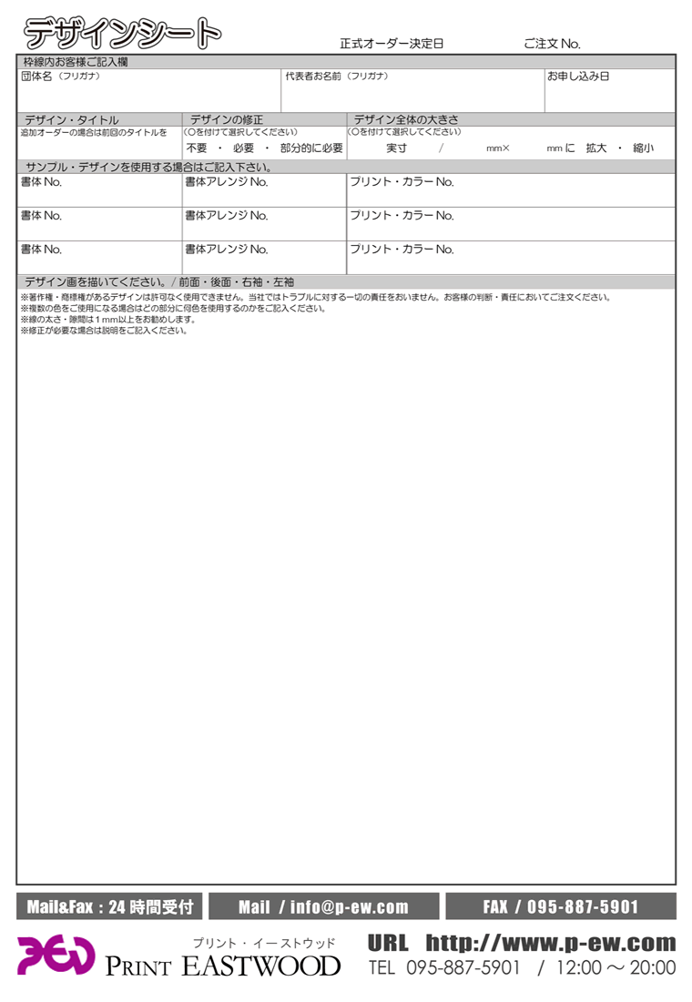 ※ 手描きのデザインをそのままプリントする場合は、Faxでは画像が劣化してしまうので、 お手数ですがMailへの添付または郵送でお送り願います。